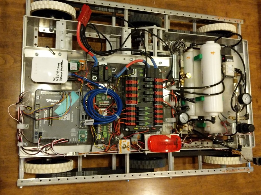 Robot 14 – Large Six Wheel Tank Drive: This robot is a FIRST Robotics competition scale machine. It uses a National Instruments RoboRio computer and a structure from AndyMark. It has a two speed pneumatically switched gearbox. Communication is via Wi-Fi through the National Instruments Windows support software. At this point it is a base structure; plans are for a mechanism to be added. The primary functions are two speed gear box, six wheel tank drive with center wheel offset.