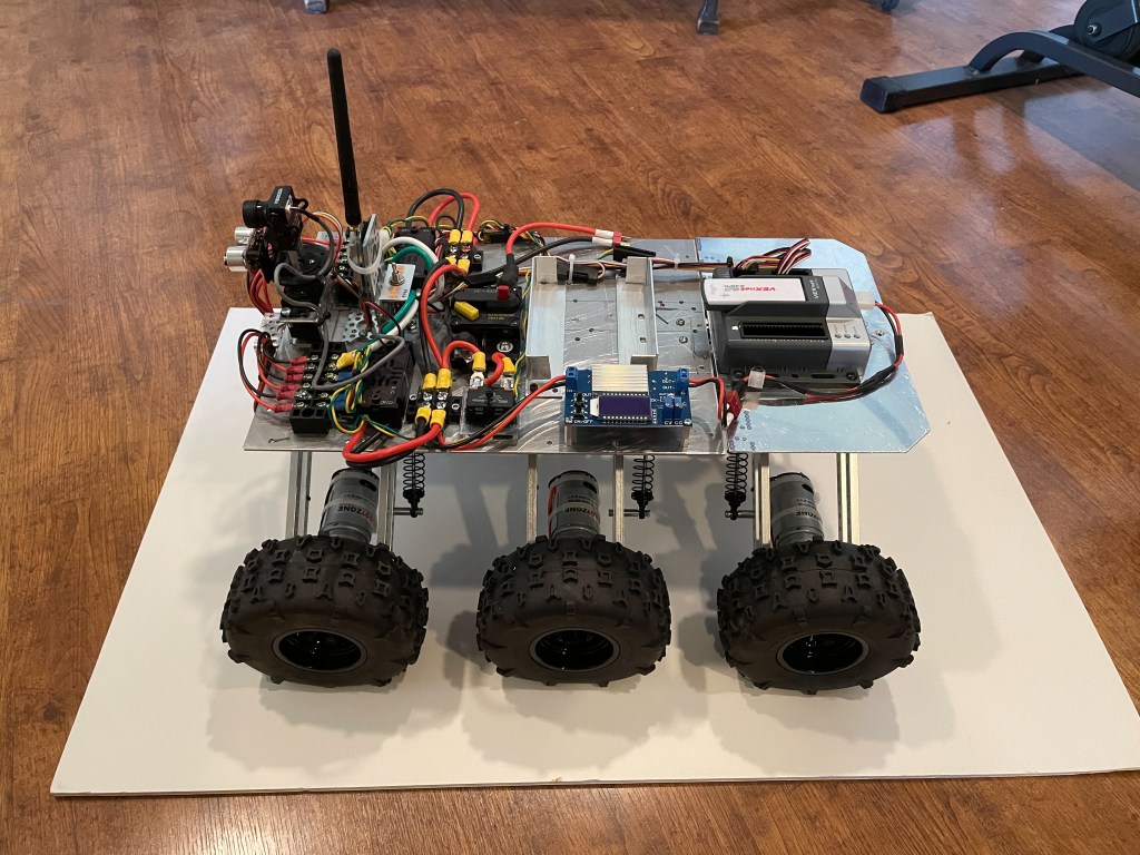 Robot 15 – Six Wheel Tank Drive With Suspension: The structure is a purchased Mantis 6WD Off-Road Rover Kit. The computer is a VEX Cosmos with the associated wireless communication and controller. The sensors include a ultrasonic range sensor and an RC camera. A lithium ion battery is used. The primary objective of this robot is investigate how a wheeled tank drive with all wheel suspension functions.