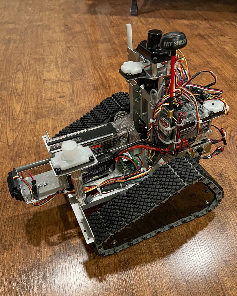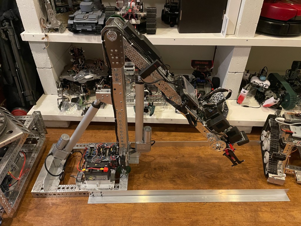Robot 20 – Five Degree of Freedom Arm and Gripper: A five degree of freedom arm and gripper was built to be mounted on a mobile base. The arms structure uses Actobotics channels, Progressive linear actuators (150 pound and 50 pound), and VEX V5 computer, communication, motors and sensors. The gripper is also VEX. The gripper has 3 degrees of freedom plus a target identification camera. The primary functions of interest were operation of a large arm, the operation of 3 degree of freedom gripper and control of object acquisition and gripping.